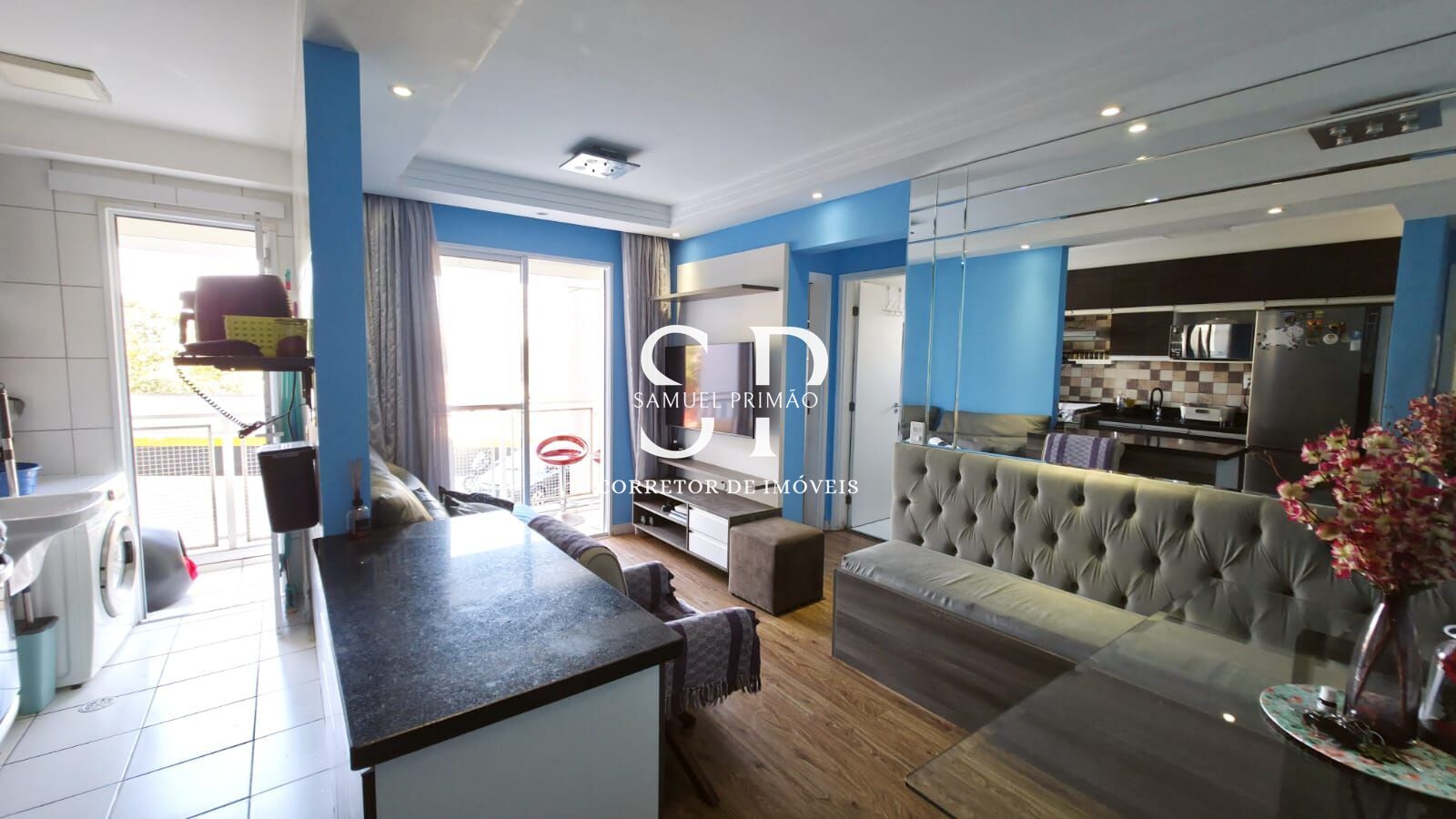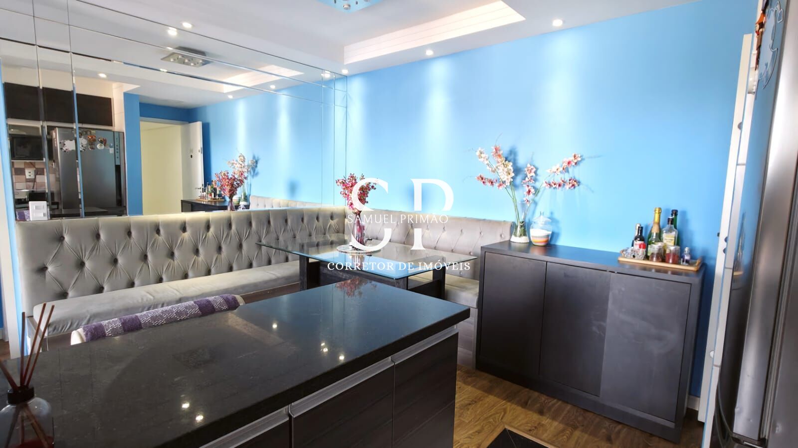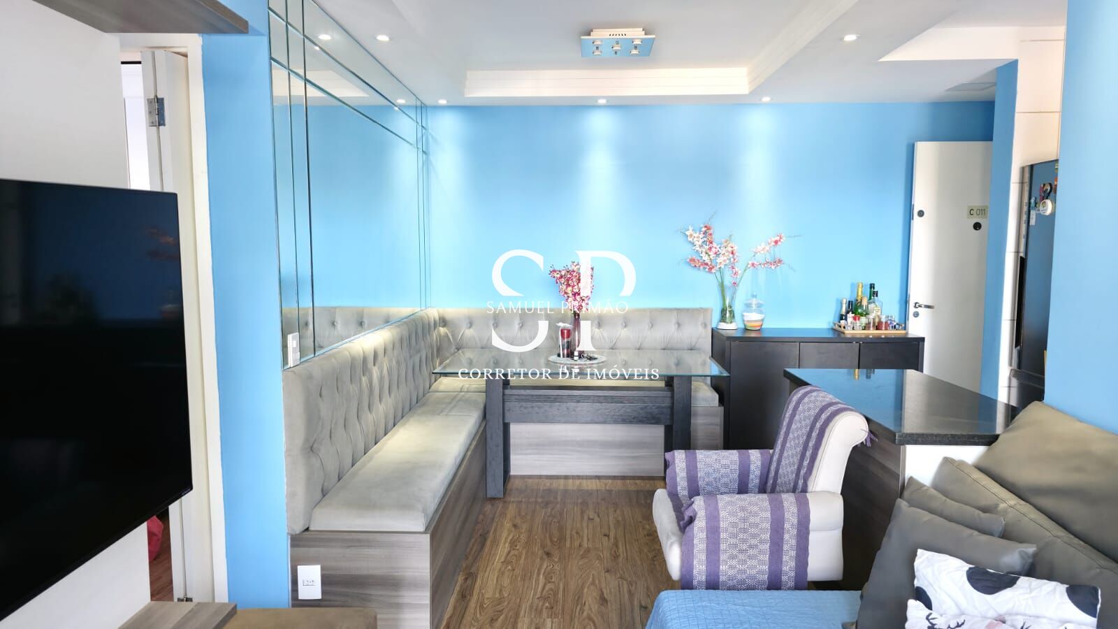 - Na sala temos um canto alemão com espelho no teto, fica também o painel planejado da tv.